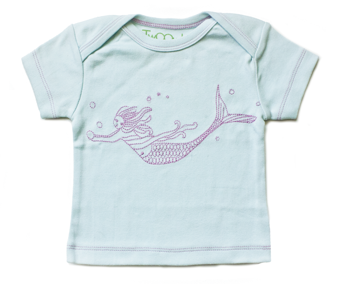 Mermaid embroidered in pink thread on a turquoise short sleeve tee