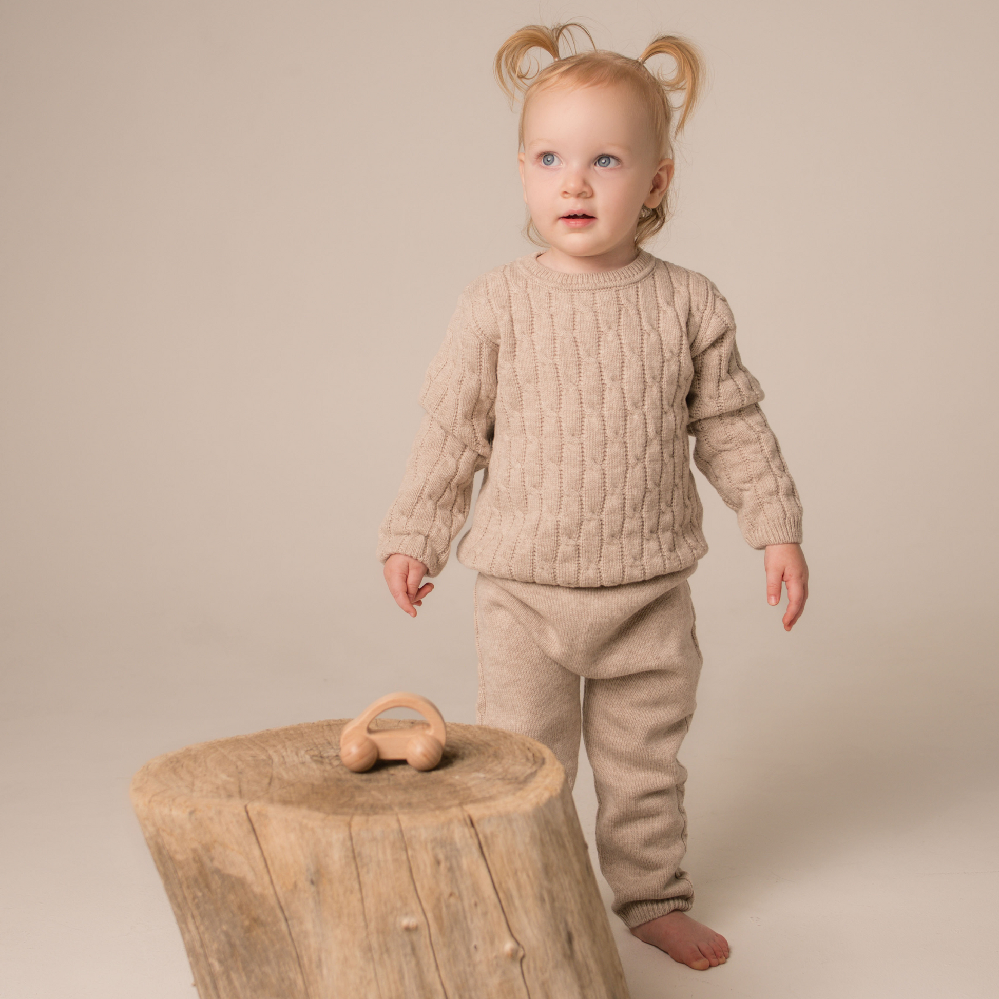 Merino Wool Cable Knit Sweater in soft oatmeal. Created in an intricate braided pattern across the front and a classic crew neck design, this piece combines sophisticated style with everyday comfort. The back opening with delicate mother-of-pearl buttons makes dressing effortless. Crafted from premium, non-shrink Italian Merino wool and Oeko-Tex 100 certified for safety, this sweater naturally regulates temperature, resists wrinkles, and wicks moisture to keep your child comfortable all day. The ultra-fine fibers are exceptionally gentle on sensitive skin, while built-in UV protection shields from sun exposure. it maintains its beauty through countless wears. A versatile wardrobe essential that pairs beautifully with our fall collection.