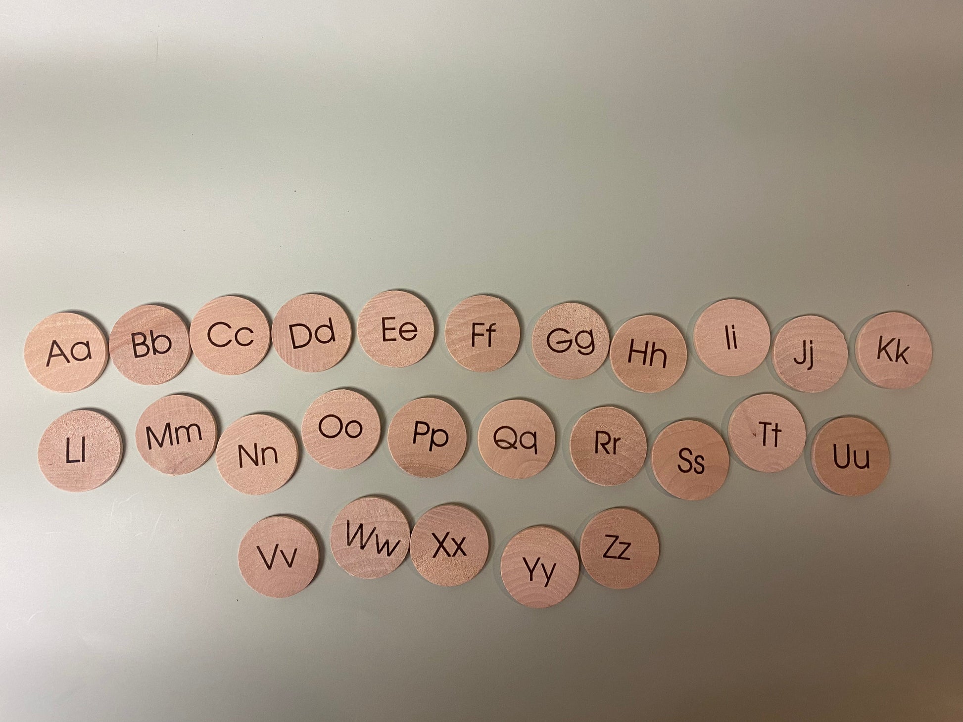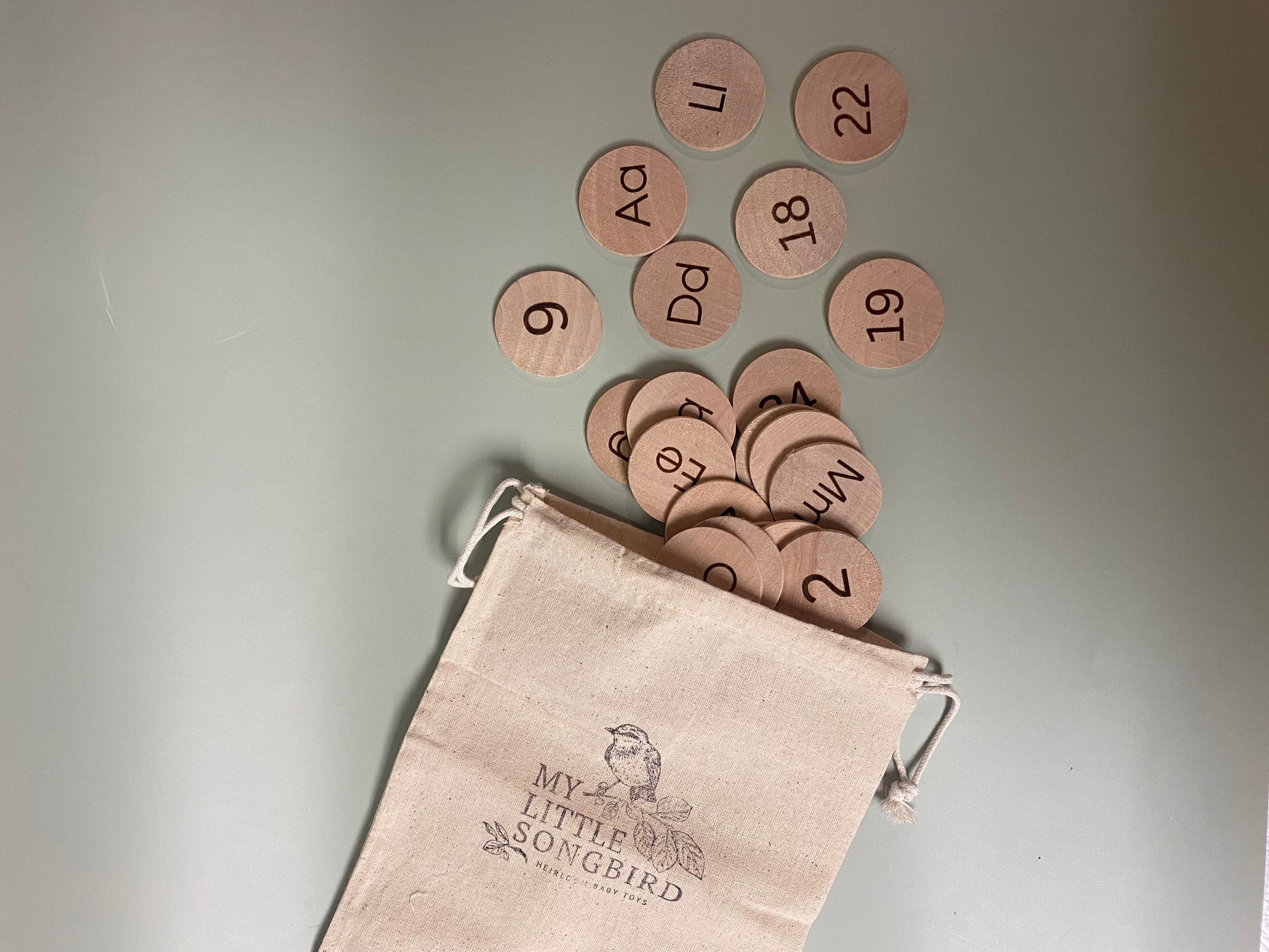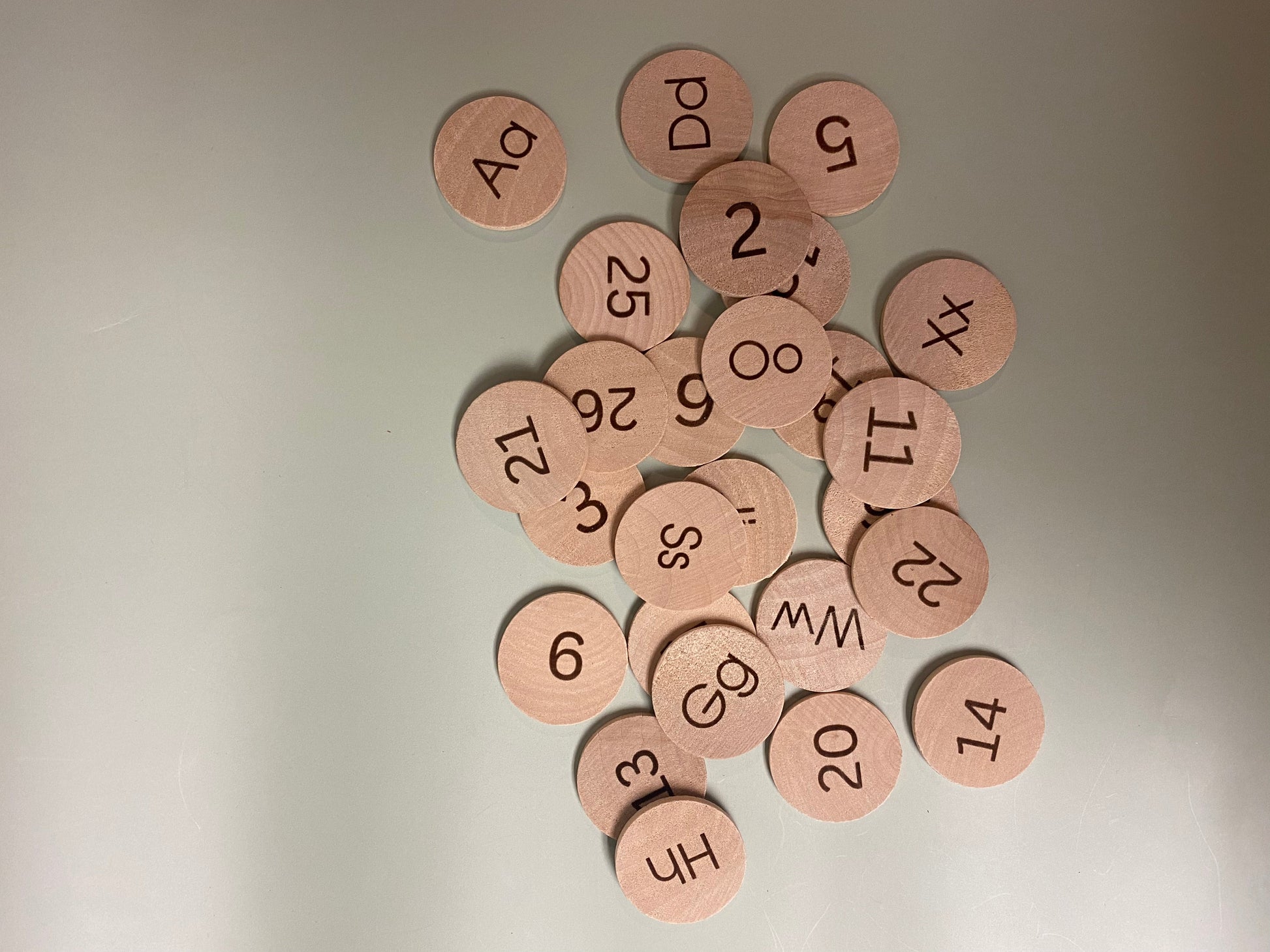 These wooden discs are two sided, A-Z on one side 1-26 on the other